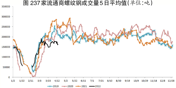 疫情除了對供應端造成影響外,也對市場流通環節帶來了負面效應。截至4月19日,全國237家流通商螺紋鋼成交量5日平均值為16.72萬噸,同比下降32.24%。從下圖不難看出,螺紋鋼成交量5日平均值在春節假期后快速攀升,符合歷史特征,但進入3月份后拐頭向下,與以往年份形成鮮明對比。這其中雖然有終端需求低迷的情況,但更主要的原因是疫情導致的多地管控。目前,疫情波及31個省、直轄市、自治區,各地根據自身疫情嚴重程度采取了不同措施,包括全域管控、全市住宅小區(含村屯)實行封閉式管理、鋼材市場停滯、下游工地待停工等。盡管有些地方的舉措不直接涉及鋼鐵行業,但市民的居家隔離和汽運暫停都對現貨市場的運營帶來影響。現階段仍處于疫情防控關鍵期,尚不能準確判斷何時會出現拐點,預計鋼材市場成交量低迷狀況短期內仍會延續。