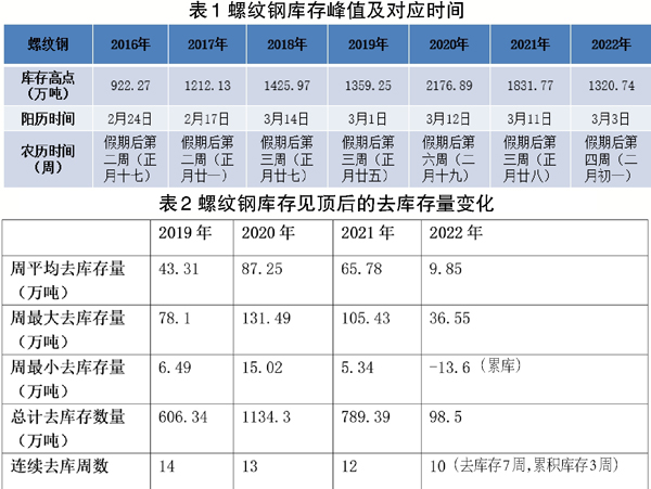 由表1可知,螺紋鋼庫存高點多出現在春節假期后第2周或第3周(農歷元月十五至廿七)。其中,2020年螺紋鋼庫存高點出現最晚,直到春節假期后第6周才達到峰值,主要原因是2020年春節時突發疫情,多地區封控和大面積居家辦公導致社會層面的生產生活停滯,最終螺紋鋼庫存突破2100萬噸,較2019年增加817.64萬噸,成為近7年歷史高點。