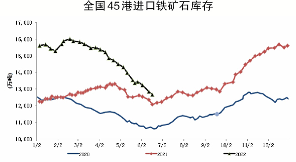 今年初以來,國內鐵礦石需求不斷走強,國內鐵水產量不斷攀升,鐵礦石持續大幅去庫存,但后期鐵礦石需求在粗鋼壓減政策及鋼廠低利潤格局下中短期均存在下降趨勢,短期由于長流程鋼廠持續虧損主動限產。6月18日當周,調研數據顯示,247家鋼廠高爐開工率為83.83%,周環比下降0.28%,同比下降3.57%;高爐煉鐵產能利用率為90.15%,周環比增加0.01%,同比下降1.47%;鋼廠盈利率為41.99%,周環比下降16.88%,同比下降44.16%。截至6月20日,據我的鋼鐵網不完全統計,國內22家鋼廠發布檢修計劃。其中,麗水華宏鋼鐵制品有限公司預計于6月19日—7月3日全廠停產檢修。預計短期鐵礦石需求將出現顯著下降,中期受粗鋼壓減政策限制。國家統計局數據顯示,2022年5月份,全國粗鋼產量為9661萬噸,同比下降3.5%。1月—5月份,全國粗鋼產量為43502萬噸,同比下降8.7%。