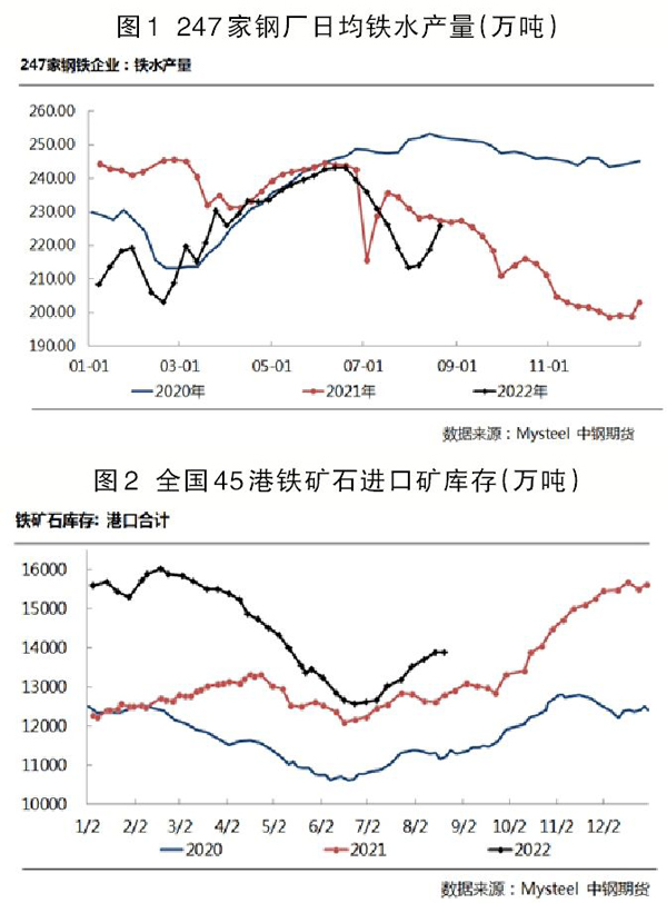 中期來看,鐵礦石國內需求邊際走弱趨勢不變。首先,在“強基建,弱地產”的市場格局下,終端需求改善的預期較弱,鐵礦石需求也將走弱;其次,原材料端的高價格嚴重蠶食著下游成材端的利潤空間,對產業的健康發展極為不利,不排除后期政策性引導粗鋼減產的可能性,中期鐵礦石需求增長的空間較為有限。國家統計局數據顯示,2022年1月—7月份,生鐵產量為51090萬噸,同比下降4.50%(2407萬噸);粗鋼產量為60928萬噸,同比下降6.40%(4166萬噸),約六成的粗鋼減量由生鐵產量下降貢獻。假設2022年粗鋼產量下降3000萬噸,且六成的同比減量由鐵水產量下降貢獻,據此推算,2022年7月—12月份日均生鐵產量為220萬噸(鋼聯口徑),環比減少3.0%,其中第三、第四季度日均鐵水產量分別為225萬噸、215萬噸。當前日均鐵水產量已經回升至225.78萬噸,鐵水產量繼續上升的空間有限,即國內鐵礦石已經處于需求最旺盛階段且后期需求將邊際走弱。