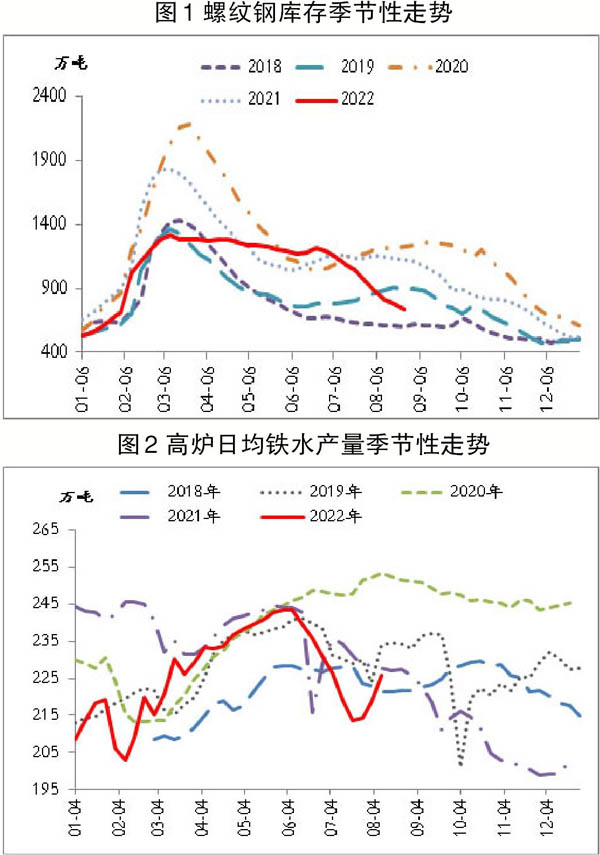 6月份之后,由于國內鋼材需求恢復力度不及預期及美聯儲加息政策延續,市場對經濟衰退的預期加劇,國內螺紋鋼期現貨價格快速下跌,跌勢一直持續至7月中旬。此后螺紋鋼價格開始觸底反彈,至8月中旬反彈動能再次出現減弱跡象。筆者認為,螺紋鋼期貨價格在年底前將延續區間震蕩走勢,但短期內螺紋鋼的價格走勢更多取決于“金九銀十”需求旺季的兌現程度。