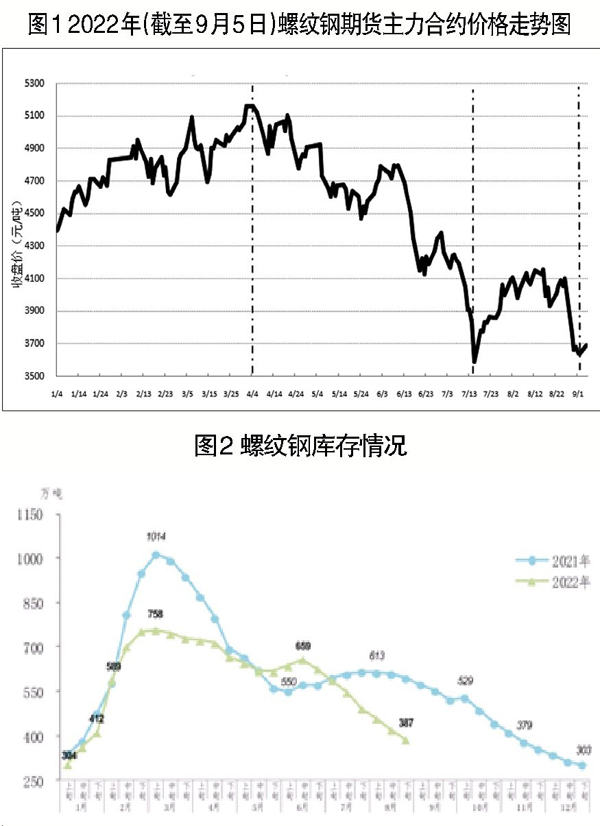 在現貨市場,螺紋鋼價格弱勢走低,但是市場交投氛圍正在趨好。中國鋼鐵工業協會市場調研部發布的報告顯示,2022年9月份第一周(8月29日—9月2日),國內市場直徑16毫米Ⅲ級螺紋鋼HRB400平均價格和指數分別為3999元/噸和113.99點,均價較上周下降123元/噸(降幅為2.98%),指數較上周下降3.50點。8月下旬,螺紋鋼庫存總量為387萬噸,環比減少33萬噸,降幅為7.9%,庫存連續快速下降;比7月下旬減少105萬噸,降幅為21.3%;比年初增加84萬噸,增幅為27.7%;比上年同期減少208萬噸,降幅為35.0%(見圖2)。9月2日,10大中心城市直徑20毫米螺紋鋼HRB400E現貨平均價格為4101/噸,較上一交易日下跌28元/噸。不過,筆者觀察到,9月份以來華東市場現貨交易量快速增加,增幅喜人,這似乎昭示著市場需求正在轉暖。