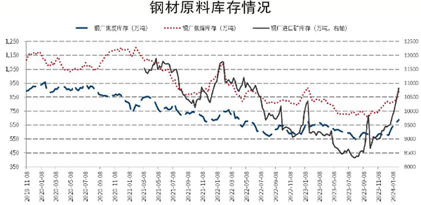 2023年是鋼材產(chǎn)能置換落地的大年,原料供給量亦有所增加,但由于2022年原料缺口較大,2023年供給雖然增加但原料的缺口仍在。進(jìn)入2024年,鋼廠充分補(bǔ)庫,原料庫存重新回升。春節(jié)后原料價(jià)格有塌陷可能,可能帶動(dòng)鋼材價(jià)格回落。