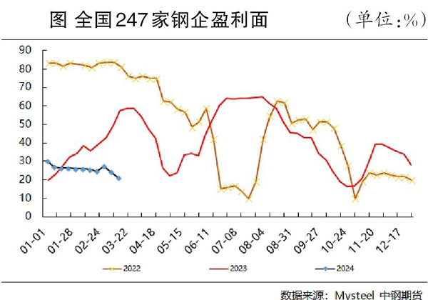 受盈利狀況不佳影響,螺紋鋼產(chǎn)量自今年初以來持續(xù)下降,到春節(jié)假期時(shí)日均產(chǎn)量?jī)H為192萬噸左右,不但是近5年來的最低值,而且比往年的低值還要少20萬噸~30萬噸。筆者認(rèn)為,出現(xiàn)這種情況有兩點(diǎn)原因:一是春節(jié)假期前后螺紋鋼產(chǎn)量出現(xiàn)季節(jié)性下降;二是鋼企盈利狀況差,截至3月15日當(dāng)周(3月11日—15日),全國247家鋼鐵企業(yè)盈利面為21.21%,同比縮小36.37個(gè)百分點(diǎn)。