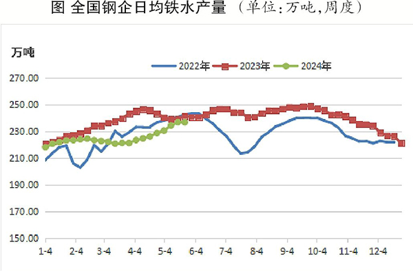 從時(shí)間點(diǎn)上來看,筆者的這一判斷也可以得到驗(yàn)證,筆者觀察到,3月29日—4月4日,鐵水產(chǎn)量開始出現(xiàn)回升。追溯鐵礦石期貨行情的變化,可以發(fā)現(xiàn),I2409合約價(jià)格是在4月1日開始反彈的。也就是說,鐵水產(chǎn)量變化的時(shí)間點(diǎn)與鐵礦石期貨價(jià)格上漲的時(shí)間點(diǎn)緊密對應(yīng)。5月24日發(fā)布的數(shù)據(jù)顯示,日均鐵水產(chǎn)量從236.89萬噸回落至236.8萬噸,未能延續(xù)繼續(xù)上升的勢頭,而5月24日發(fā)布的數(shù)據(jù)實(shí)際上反映的是5月17日—5月23日的高爐生產(chǎn)情況。也就是說這一時(shí)期需求已經(jīng)停止擴(kuò)張,產(chǎn)業(yè)層面的利多影響已經(jīng)淡化。