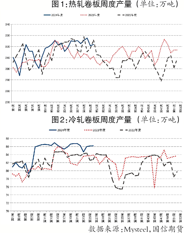 供應方面,2024年上半年熱軋卷板供應維持在相對高位,尤其在進入5月份后,熱軋卷板周度產量一直在320萬噸以上,比2023年同期增加10萬噸左右;冷軋卷板周度產量也攀升至86萬噸左右的水平,較去年同期的82萬噸~84萬噸有所增加。