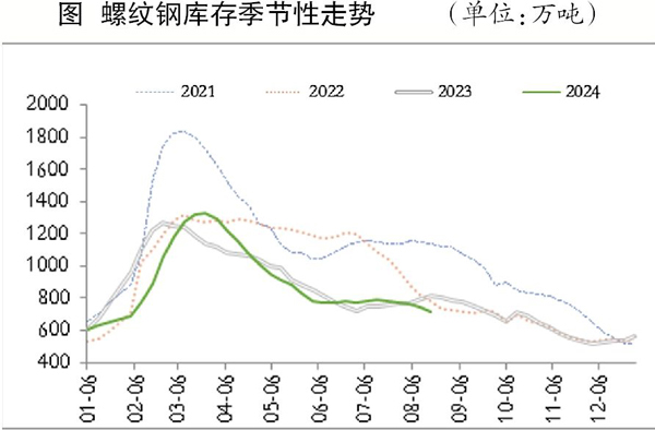 7月份以來,螺紋鋼期現貨價格均呈現大幅下挫趨勢,截至8月11日,螺紋鋼主力合約2410價格收于3277元/噸,相比7月初下跌近8%。目前產業鏈負反饋仍在繼續,價格仍有進一步下跌空間。之后,隨著螺紋鋼期貨主力合約移倉換月的結束及需求旺季的到來,價格可能會逐步企穩。但螺紋鋼價格能否反彈仍取決于旺季需求的表現。
