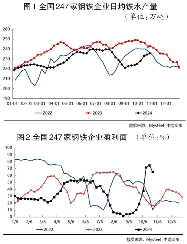 需求方面,宏觀預期提振下的需求脈沖式上升仍需后期財政政策的強刺激支撐配合。上周鋼企盈利率回落且鋼材價格回落幅度較大,鋼企利潤已經被顯著壓縮,短流程平電成本價格已經轉化為強壓力,即國內階段性高需求持續性存疑。據相關機構統計,全國247家鋼企高爐開工率為82.14%,周環上升0.46個百分點 ,同比下降0.35個百分點;高爐煉鐵產能利用率為88.48%,周環比上升0.49個百分點,同比下降2.25個百分點;鋼企盈利面為64.94%,周環比下降9.52個百分點,同比上升48.49個百分點;日均鐵水產量為235.69萬噸,周環比增加1.33萬噸,同比減少7.04萬噸。