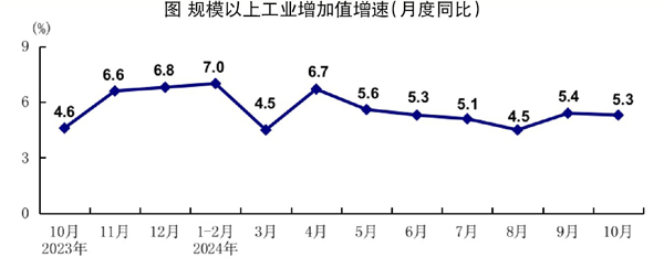 10月份,全國規模以上工業增加值同比增長5.3%,環比增長0.41%。其中,制造業增加值同比增長5.4%,裝備制造業增加值同比增長6.6%,高技術制造業增加值同比增長9.4%。分產品看,新能源汽車和工業機器人產量同比分別增長48.6%和33.4%。1月—10月份,全國規模以上工業增加值同比增長5.8%,與1月—9月份持平。10月份,制造業采購經理指數為50.1%,環比上升0.3個百分點;企業生產經營活動預期指數為54.0%,環比上升2.0個百分點。