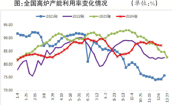 從高頻數(shù)據(jù)來看,受利潤狀況影響,全國高爐產(chǎn)能利用率自11月中旬以來持續(xù)下行,這直接反映了鐵礦石需求的明顯萎縮。相關(guān)數(shù)據(jù)顯示,盈利鋼企占比自10月份的74%左右下降至48%左右,而全國高爐產(chǎn)能利用率自11月中旬的88.58%下降至87.28%。調(diào)研信息顯示,隨著鋼企盈利狀況的持續(xù)惡化,高爐檢修范圍或繼續(xù)擴(kuò)大,鐵水產(chǎn)量或進(jìn)一步下降,鐵礦石短期需求也將繼續(xù)收縮。