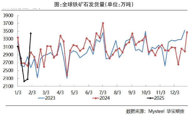 截至2月2日當周(1月27日—2月2日)全球鐵礦石發運總量為3447.3萬噸,環比增加1163.7萬噸。澳大利亞、巴西鐵礦石發運總量為2770.4萬噸,環比增加901.7萬噸。澳大利亞鐵礦石發運量為2067.1萬噸,環比增加832.5萬噸,其中澳大利亞發往中國的鐵礦石量1744.8萬噸,環比增加776.7萬噸。巴西鐵礦石發運量為703.2萬噸,環比增加69.0萬噸。