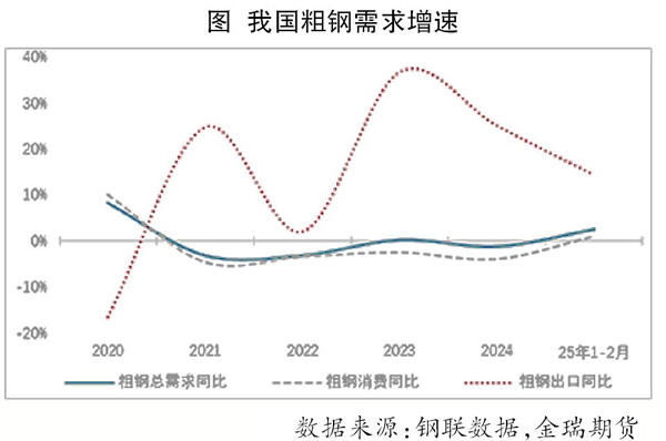 根據(jù)測算,2025年1月—2月份我國粗鋼表觀需求累計同比增長2.5%,增速由2024年全年的-1.2%轉(zhuǎn)正。其中,國內(nèi)粗鋼消費累計同比增長1.0%,去年全年同比減少4.0%;粗鋼出口累計同比增長14.3%,增速較2024年回落10.7個百分點。