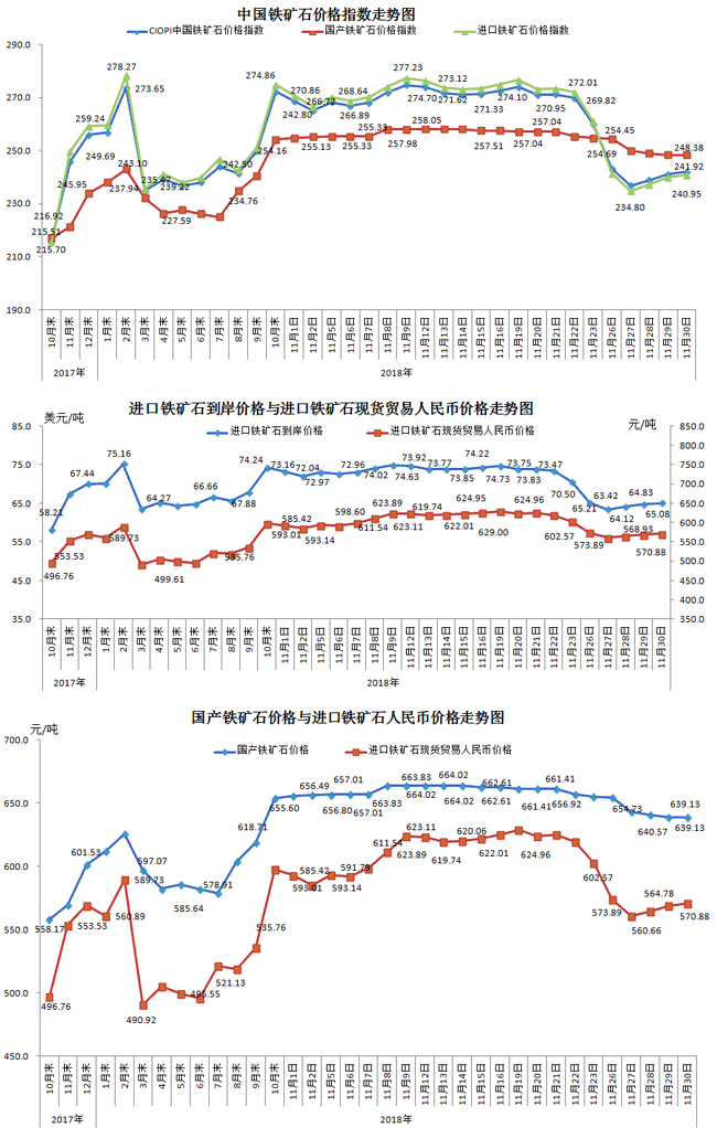 11月30日,中國鐵礦石價格指數(CIOPI)241.92點,環比上升0.80點,升幅為0.33%。其中:國產鐵礦石價格指數為248.38點,環比持平;進口鐵礦石價格指數為240.95點,環比上升0.93點,升幅為0.39%。