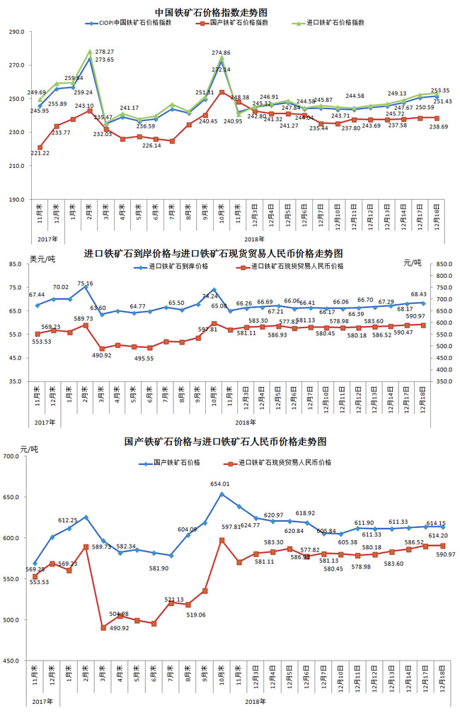 12月18日,中國鐵礦石價格指數(CIOPI)251.43點,環比上升0.84點,升幅為0.33%。其中:國產鐵礦石價格指數為238.69點,環比上升0.02點,升幅為0.01%;進口鐵礦石價格指數為253.35點,環比上升0.96點,升幅為0.38%。