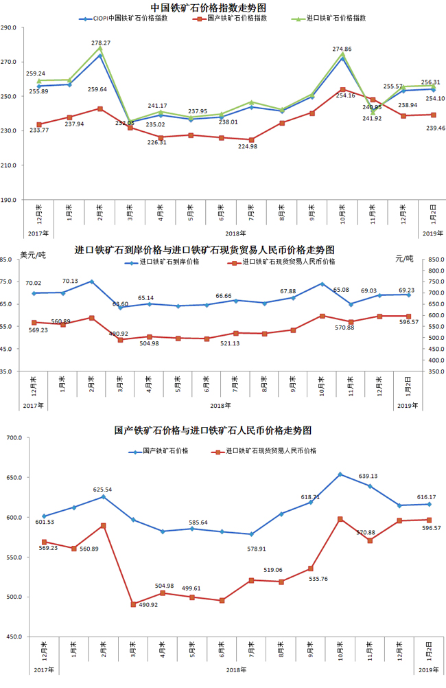 1月2日,中國鐵礦石價格指數(shù)(CIOPI)254.10點(diǎn),環(huán)比上升0.71點(diǎn),升幅為0.28%。其中:國產(chǎn)鐵礦石價格指數(shù)為239.46點(diǎn),環(huán)比上升0.52點(diǎn),升幅為0.22%;進(jìn)口鐵礦石價格指數(shù)為256.31點(diǎn),環(huán)比上升0.74點(diǎn),升幅為0.29%。