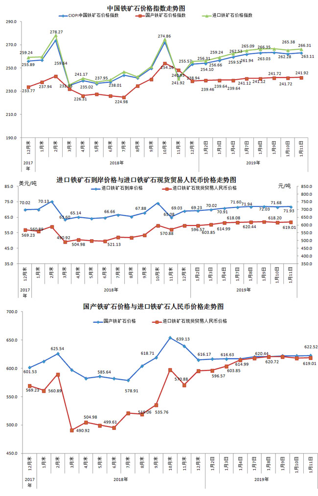 1月11日,現(xiàn)貨貿(mào)易進口鐵礦石62%品位干基粉礦人民幣含稅價格為619.01元/噸,環(huán)比每噸上升0.81元,升幅為0.13%,當月平均價格為613.98元/噸。
