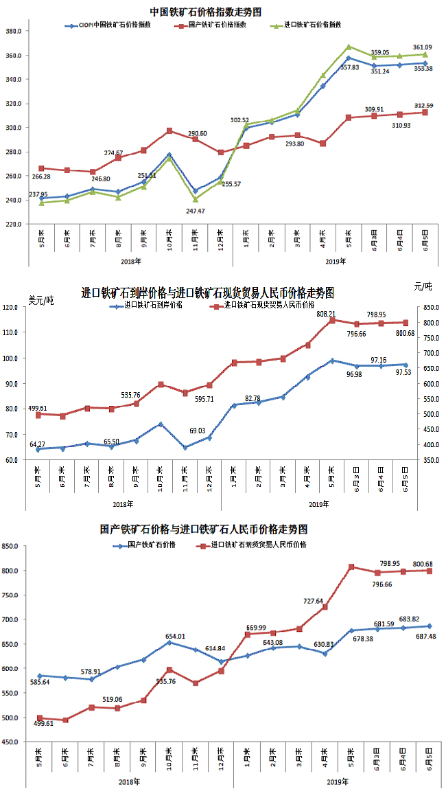 6月5日,中國鐵礦石價格指數(CIOPI)353.38點,環(huán)比上升1.42點,升幅為0.40%。其中:國產鐵礦石價格指數為312.59點,環(huán)比上升1.66點,升幅為0.53%;進口鐵礦石價格指數為361.09點,環(huán)比上升1.37點,升幅為0.38%。