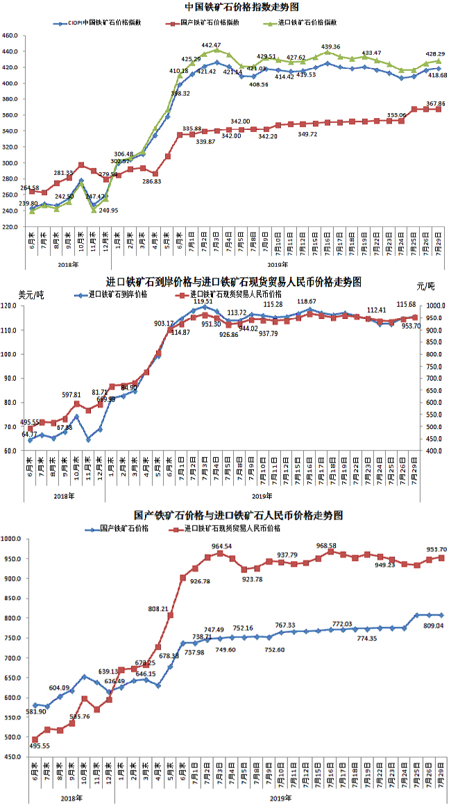 7月29日,現(xiàn)貨貿(mào)易進(jìn)口鐵礦石62%品位干基粉礦人民幣含稅價格為953.70元/噸,環(huán)比每噸上升5.48元,升幅為0.58%,當(dāng)月平均價格為947.04元/噸。