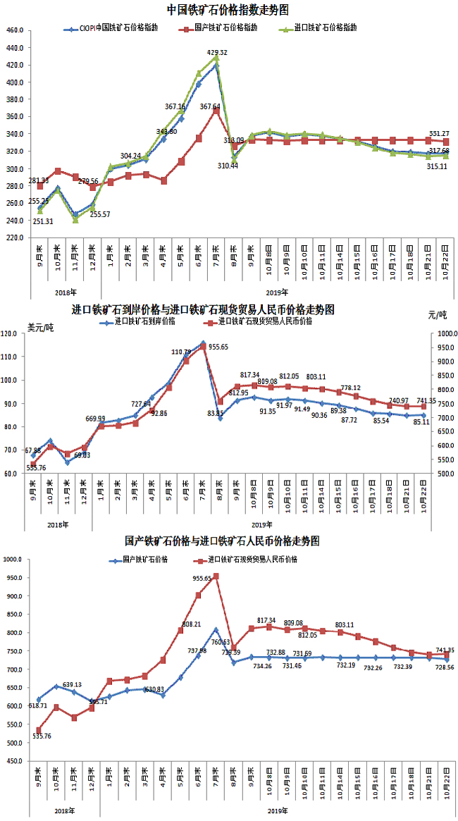 10月22日,中國鐵礦石價格指數(CIOPI)317.68點,環比上升0.41點,升幅為0.13%。其中:國產鐵礦石價格指數為331.27點,環比下降1.54點,降幅為0.46%;進口鐵礦石價格指數為315.11點,環比上升0.78點,升幅為0.25%。