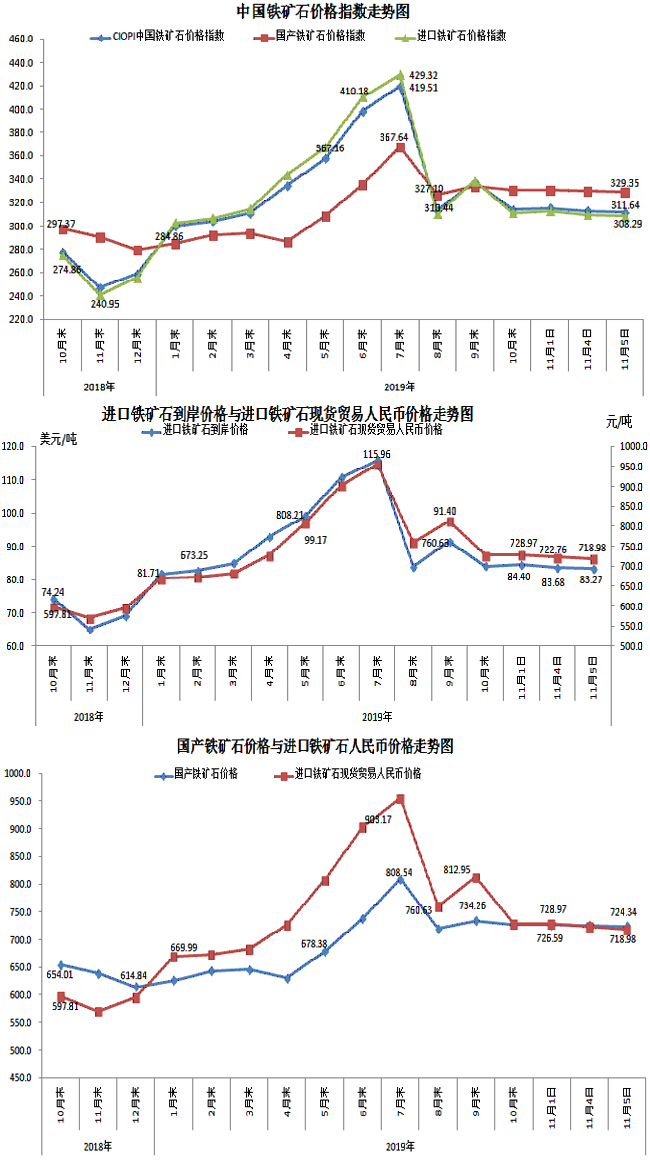 11月5日,中國鐵礦石價格指數(CIOPI)311.64點,環比下降1.35點,降幅為0.43%。其中:國產鐵礦石價格指數為329.35點,環比下降0.43點,降幅為0.13%;進口鐵礦石價格指數為308.29點,環比下降1.52點,降幅為0.49%。
