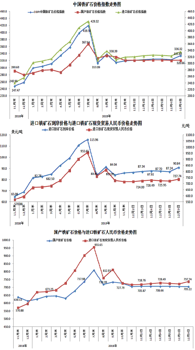 12月9日,中國鐵礦石價格指數(shù)(CIOPI)333.83點,環(huán)比上升11.26點,升幅為3.49%。其中:國產(chǎn)鐵礦石價格指數(shù)為320.66點,環(huán)比上升0.35點,升幅為0.11%;進(jìn)口鐵礦石價格指數(shù)為336.32點,環(huán)比上升13.33點,升幅為4.13%。