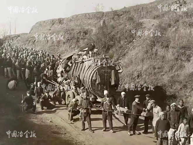 1946年2月,八路軍軍工部經(jīng)考察后,決定在山西長治故縣村東的溝壑里建設(shè)故縣鐵廠(首鋼長鋼公司的前身)。為建設(shè)該廠,1947年5月初,晉冀魯豫邊區(qū)政府決定將陽泉榮華鐵廠20噸高爐及其附屬設(shè)備整體搬遷至故縣。陽泉到長治全長200多公里,一路崇山峻嶺,邊區(qū)軍工部組織200余人,在沒有大型運載工具的情況下逢山開路、遇水搭橋,前后往返3次,歷時3個月,終于將高爐全套設(shè)備搬遷到故縣。1947年底,20噸高爐正式投產(chǎn),故縣鐵廠開始大批量生產(chǎn)各種規(guī)格型號的迫擊炮彈殼,有力支援了各個解放戰(zhàn)場,這座高爐也被譽為“功勛爐”。圖為1947年搬運高爐設(shè)備時的場景。(首鋼長鋼廠史展覽館 供圖)