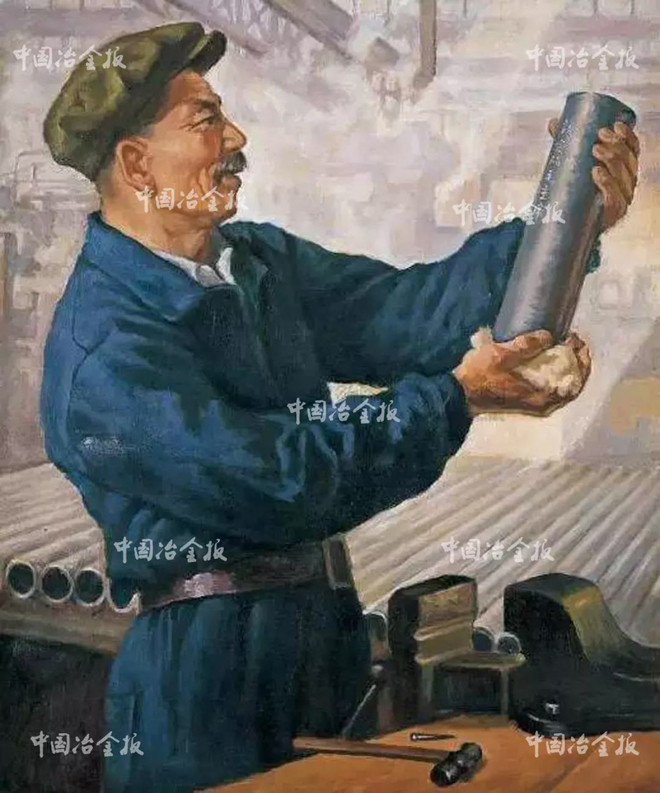 1953年10月27日,新中國第一根無縫鋼管在鞍鋼軋制成功。1953年12月26日,毛主席60歲生日那一天,他收到了一份特殊的生日禮物。工人們從鞍鋼生產(chǎn)的第一根無縫鋼管上切下了長20厘米的一段,派專人送到北京。毛主席給鞍鋼全體職工復(fù)信祝賀:“鞍鋼無縫鋼管廠、大型軋鋼廠和第七號高爐的提前完成建設(shè)工程并開始生產(chǎn),是1953年我國重工業(yè)發(fā)展中的巨大事件。”1954年,《人民日報》上刊登了靳尚誼和傅植桂創(chuàng)作的油畫《把第一根無縫鋼管獻給毛主席》(如圖),油畫主人公是鉗工邵明祥,他在鋼管上刻下了一行字:“獻給敬愛的毛主席”。(鞍鋼 供圖)