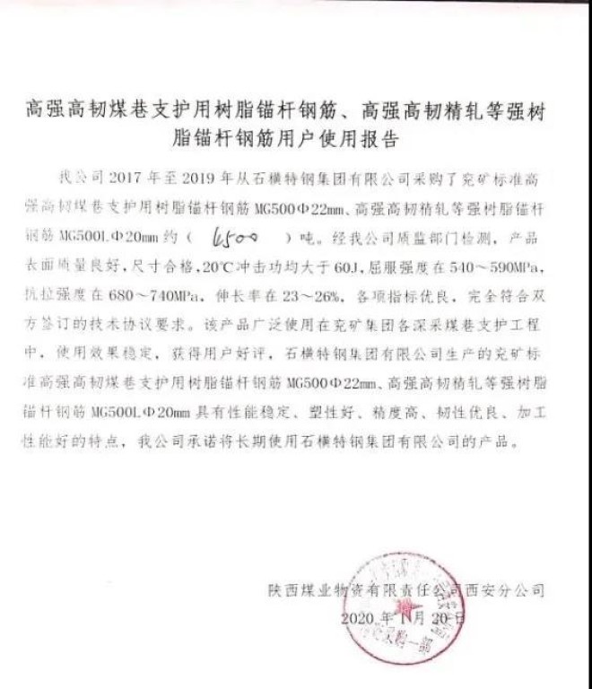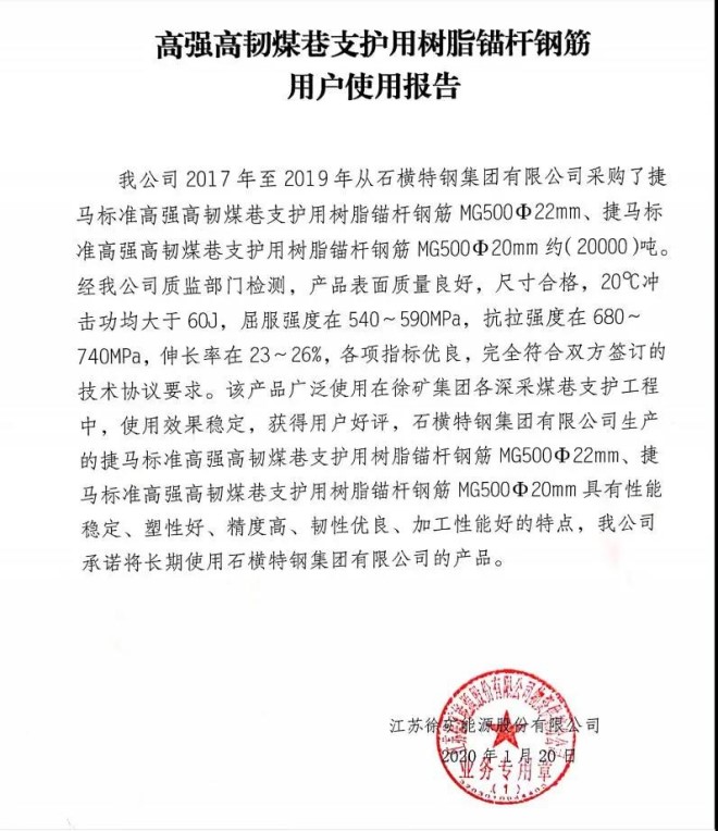 “我公司隨后第一時間將個性化定制的高強錨桿鋼(SKW5)送到現場,解決了客戶的燃眉之急,確保了巷道支護安全,客戶對此交口稱贊。由此成為石橫特鋼忠誠的直供礦務局客戶?!壁w峰介紹。