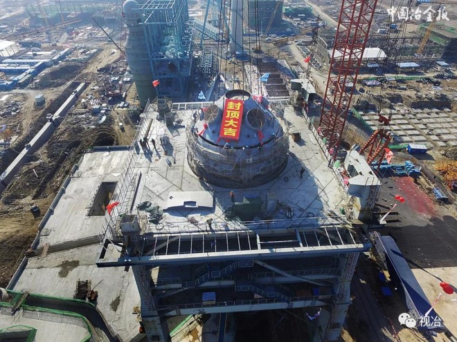 2016年11月24日9時56分,山鋼集團(tuán)日照鋼鐵精品基地項目建設(shè)的標(biāo)志性工程——煉鐵工程1號5100立方米高爐開始封頂(如圖)。20分鐘之后,重達(dá)95噸的煤氣封罩起吊后穩(wěn)穩(wěn)就位在高爐爐殼頂部。這個被譽(yù)為“齊魯?shù)谝粻t”的高爐順利封頂,提前37天完成年度計劃節(jié)點(diǎn)。(游建平 攝)