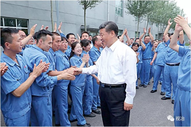 2017年6月22日,中共中央總書記、國家主席、中央軍委主席習(xí)近平在山西太原考察企業(yè)。圖為習(xí)近平在山西鋼科碳材料有限公司同職工親切交流。(新華社記者 龐興雷 攝)