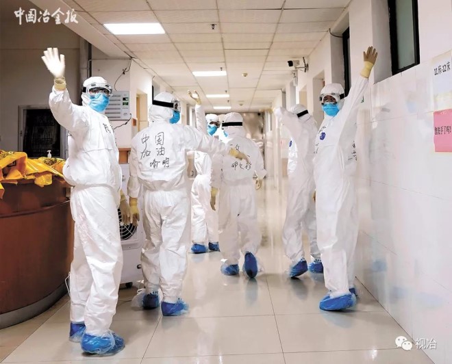2020年3月6日,新鋼中心醫院醫護人員圓滿完成了江西省新余市新冠肺炎患者的救治任務,醫務人員在對病區消毒、整理后,正式撤離至新余市袁河賓館開始集中隔離。圖為部分醫護人員向隔離病區揮手告別。(歐陽斯娟 攝)