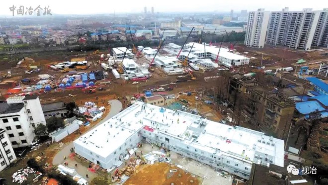 在疫情防控阻擊戰中,中國一冶在做好內部防控的同時,還積極參與武漢雷神山、火神山、鄂州雷山等醫院建設。圖為 2020年2月4日,中國一冶承建的鄂州雷山醫院項目。(陳明 攝)