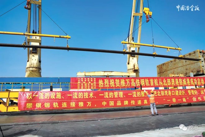 2020年11月28日上午10時30分,由鞍鋼集團攀鋼和廣西北部灣國際港務集團共同主辦的雅萬高鐵長定尺鋼軌出口首航儀式在北部灣舉行(如圖)。據悉,雅萬高鐵是中國高鐵全系統、全要素、全生產鏈走出國門的“第一單”,也是“一帶一路”的標志性工程。攀鋼鋼軌以優異的品質、最佳的技術營銷服務和最可行的物流運輸解決方案,贏得雅萬高鐵項目全部供軌訂單,供貨總量達38000噸。(王訓華/文 張瑜/ 攝)