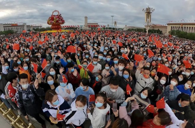 10月1日晨,游客揮舞國(guó)旗在北京天安門廣場(chǎng)觀看國(guó)慶升旗儀式。中國(guó)日?qǐng)?bào)記者 朱興鑫 攝