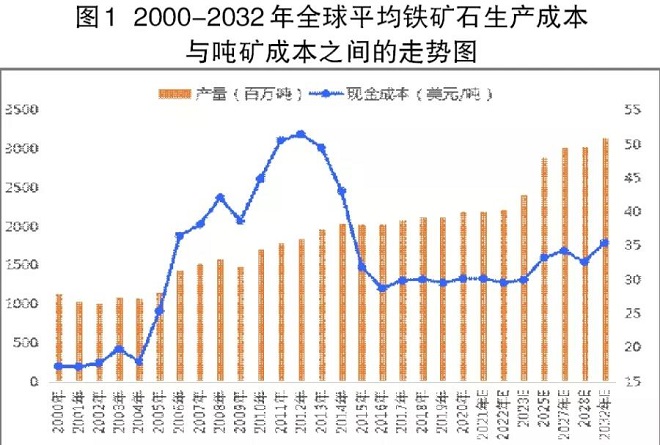 從行業發展的角度上看,2004年以前,由于中國鋼鐵工業的發展尚未成熟,全球鐵礦石市場一直延續著以長期協議定價為基礎的平穩發展態勢;2004年后,尤其是2006年以來,中國鋼鐵工業迅猛發展,中國粗鋼產量全球占比不斷提高,為滿足中國市場對鐵礦石不斷增長的需求,鐵礦石市場容量不斷擴大。伴隨著新增產能的釋放,2008年后以全球第四大鐵礦石巨頭FMG為代表的市場新增力量進入鐵礦石市場。在同一階段,鐵礦石定價規則改為依據普氏價格指數定價,新增產能一度推高鐵礦石成本在2011年前后上升至50美元/噸以上,市場供給的充足與行業競爭的加劇使得鐵礦石市場供大于求,價格在2013年開始下行。而伴隨著新增產能的逐漸釋放,全球鐵礦石平均生產成本不斷攤低,至2016年,全球鐵礦石行業平均FOB(離岸成本)下降至27美元/噸。2017年以來,伴隨著鐵礦石市場的大規模圍繞成本與價格之間的洗牌,行業以四大鐵礦生產商為代表的壟斷格局愈發明顯。在壟斷格局下,淡水河谷、力拓、必和必拓和FMG四大礦山不斷通過提高主力礦山產量和提高科技應用水平降低生產成本以保持對全球其他鐵礦石生產商的行業持續競爭能力。