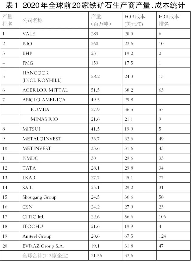 根據全球權威行業數據,2020年全球鐵礦石產量前20家的企業共生產了14.54億噸鐵礦石,占全球總量的67%以上,而這20家企業中除安賽樂米塔爾、LKAB、首鋼、鞍鋼4家公司外,其他的企業FOB成本均低于或接近全球32.6美元/噸的平均值。
