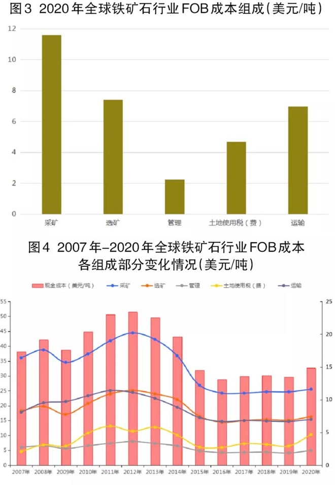 從2007年~2020年全球鐵礦石FOB成本構成的變化曲線上看,由于四大礦山壟斷程度的增強,全球FOB生產成本被控制在較低水平,四大礦山通過嚴格的成本控制保持市場的絕對占有率。