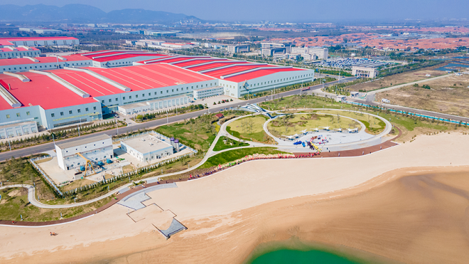 “通過設計優化,將成品碼頭與陸地之間原用于填海造地的30多公頃海域保留了下來,同時保留了珍貴的自然岸線,以此為基礎建設了沙灘公園,真正體現了節約資源、保護資源的責任擔當,踐行了人與自然和諧共生的綠色發展方式,展現出了自然生態文明與現代工業文明交相呼應的美好畫面。”站在黃海之濱的海邊金沙灘,聶延忠介紹,如果環保做不好,藍天碧海金沙灘就會消失不見,沙灘公園就會變成垃圾場。