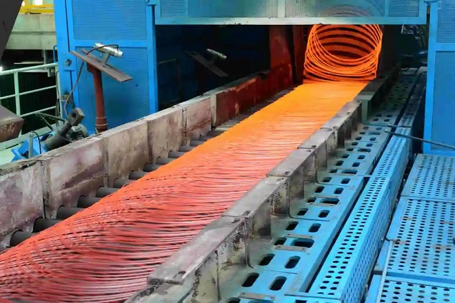 走進青島特鋼軋線車間,只見吐絲機不停地吐出鋼簾線用盤條,隨即,一圈一圈的火紅盤條錯落有致地排列開來,隨著產線向前移動,火紅的盤條逐漸顯露出鋼鐵泛著藍光的本色,繼而被送至打捆機處打捆……