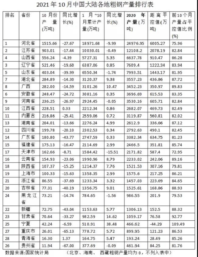 從最新粗鋼產量數據來看,寧夏是唯一一個前10個月粗鋼產量超過去年整年粗鋼產量(平控值)的省份,接近超過10%;甘肅、廣西、云南、吉林、新疆等地粗鋼壓產任務相對較重。從前10個月累計粗鋼產量來看,天津同比降幅最大,下降15.51%;其次是河北省,同比降幅為9.99%;同比增幅最大是寧夏,為38.48%.(詳見下表)