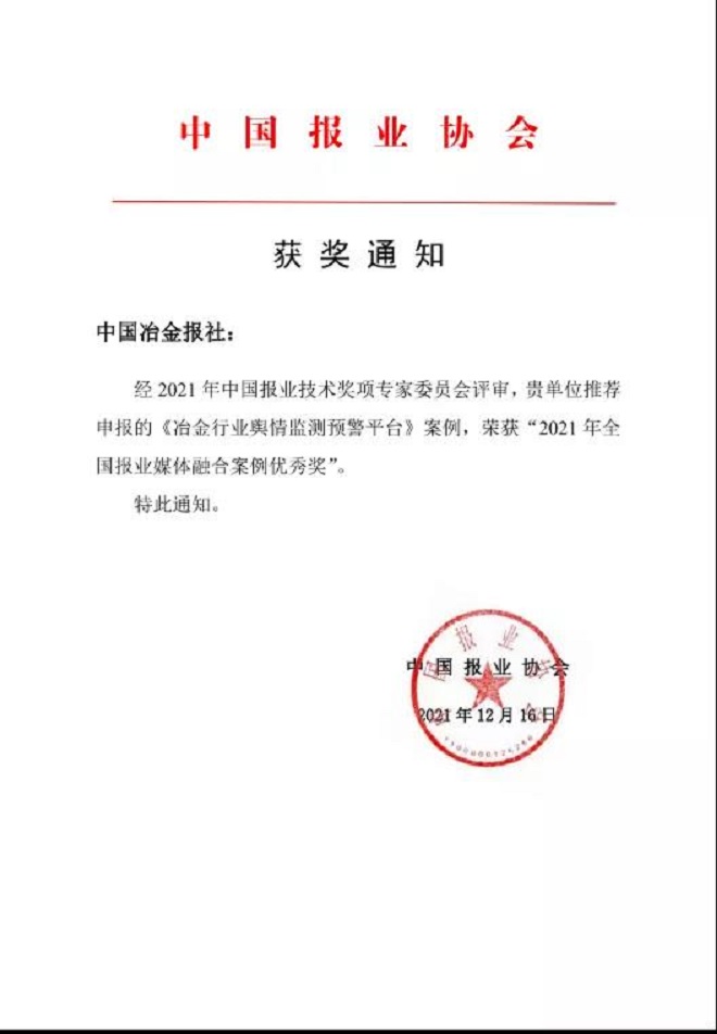 經(jīng)2021年中國報業(yè)技術(shù)獎項專家委員會評審,《冶金行業(yè)輿情監(jiān)測預警平臺》案例榮獲“2021年全國報業(yè)媒體融合案例優(yōu)秀獎”。
