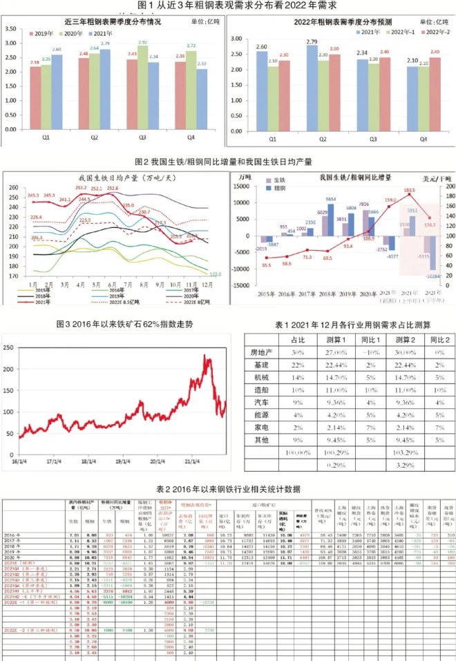 目前市場對于2022年行業運行發展的主要關注點在于:一是2021年下半年減產成效顯著,2022年是否能鞏固這一成果?二是鋼鐵行業能否精準把握商品供需基本面及行業發展規律,抓住市場機遇提質增效,提升行業在產業價值鏈上的地位?三是后疫情時代耐用品消費終將退潮,2022年我國將在房地產、基建等傳統鋼鐵消費領域釋放多大的穩增長力度?