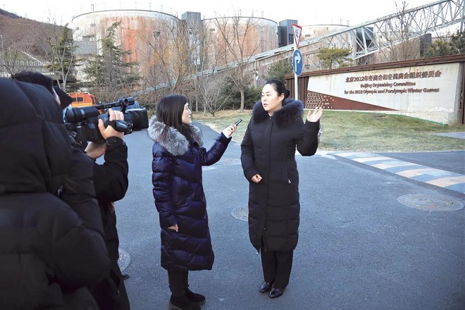 2021年12月16日,中國冶金報社記者在位于首鋼北京園區的北京冬奧組委門前采訪首鋼職工轉型代表姜金玉。