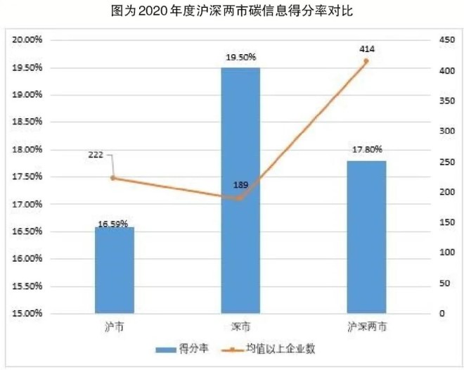 滬深兩市企業碳信息披露得分接近?!秷蟾妗凤@示,在開展碳信息披露工作的企業中,滬市碳信息披露得分率為16.59%;深市碳信息披露得分率為19.50%,深市企業碳信息披露得分率略高于兩市總體平均得分率。