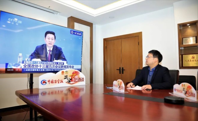 2022年3月3日下午,全國政協(xié)十三屆五次會議新聞發(fā)布會在北京召開。圖為中國冶金報社兩會報道組記者朱曉波通過網(wǎng)絡(luò)視頻“云”參會。