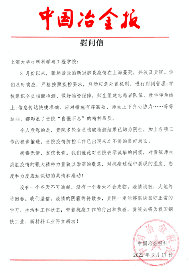 中國冶金報社致上海大學(xué)材料科學(xué)與工程學(xué)院的慰問信 ·