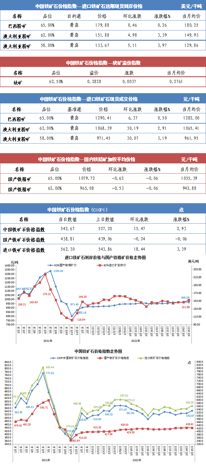 【行業指數】3月25日中國鐵礦石價格指數