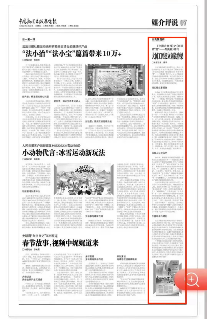 中國冶金報(bào)社組織的這些報(bào)道也得到了新聞媒體界的關(guān)注與肯定?!吨袊侣劤霭鎻V電報(bào)》評(píng)述認(rèn)為,《中國冶金報(bào)》的《鋼鐵驕“奧”——冬奧篇》特刊從行業(yè)紀(jì)實(shí)角度,以行業(yè)當(dāng)事人的視角,通過今昔場(chǎng)景對(duì)比,采寫形成既符合傳播者意圖又能滿足受眾需求的作品,敘述了從2008年北京奧運(yùn)會(huì)到2022年北京冬奧會(huì),中國鋼鐵高站位、大格局推進(jìn)結(jié)構(gòu)調(diào)整,彰顯出重要的國家使命。