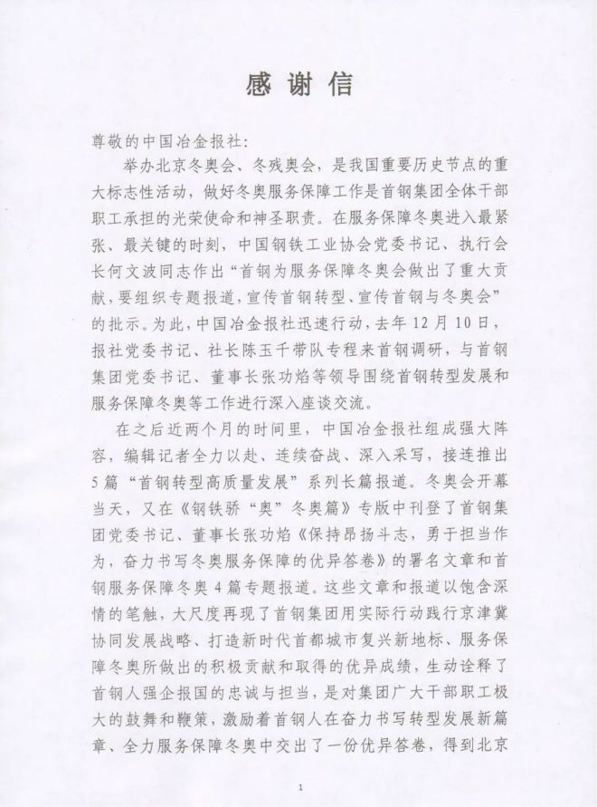 3月28日,首鋼集團(tuán)向中國冶金報(bào)社發(fā)來感謝信,對(duì)報(bào)社圍繞首鋼轉(zhuǎn)型發(fā)展和服務(wù)保障冬奧等工作進(jìn)行的一系列專題報(bào)道表示感謝。