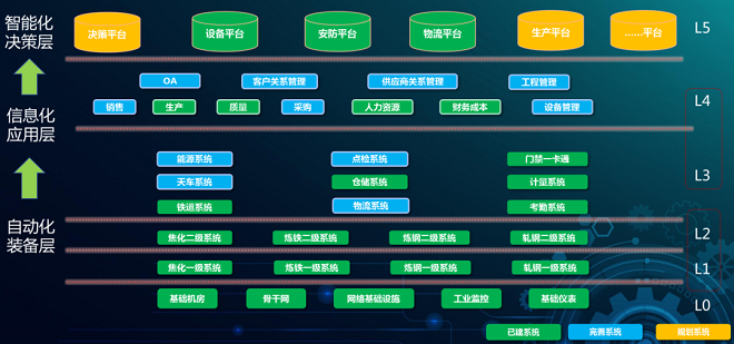 吉林建龍工廠建設歷時3年,于2011年順利投產,作為建龍集團新建鋼鐵子公司,在設計之初充分考慮了工廠自動化布局,具有完備的網絡基礎建設和能夠實現控制數據全面采集的基礎儀表建設,同時在焦化、煉鐵、煉鋼、軋鋼領域均采用自動化控制系統輔助生產操作,為后續智慧制造建設打下堅實基礎。